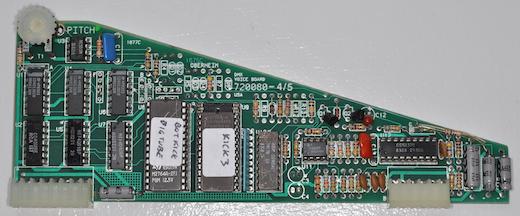 Every voice card has three possible triggers: 1, 2 and 3. These correspond to the three pushbuttons for a voice on the DMX front panel, from top to bottom, in that order. When a voice card is triggered, a binary counter starts addressing the EPROM(s) on the voice card, and the data bits feed into a Digital to Analog Converter (DAC). This multiplying DAC also behaves as a Voltage Controlled Amplifier (VCA), and its output goes through a low-pass Voltage controlled filter (VCF) before leaving the voice card. Two simple envelope generators are also included which can control the VCA and/or the VCF.
