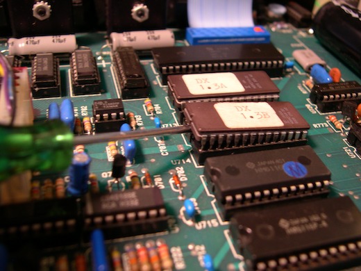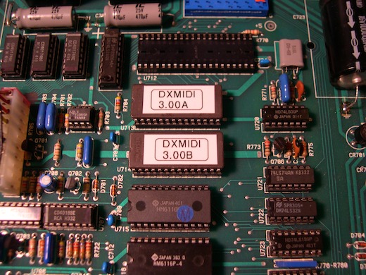 - Install the supplied DXMIDI EPROMs in place of the old ones. EPROM "A" goes in the