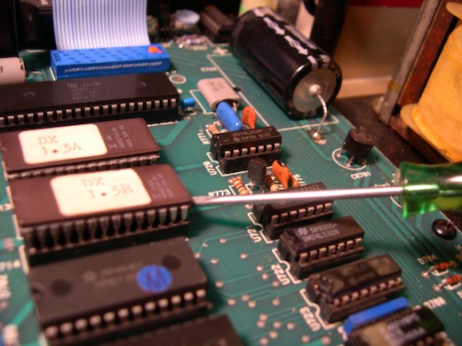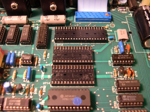 - Remove the two operating system EPROMs (U713, U714) from their sockets. Use a small screwdriver to lever the