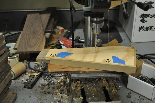 After the blanks are cut to rough size and shape, a jig is used for drilling the two