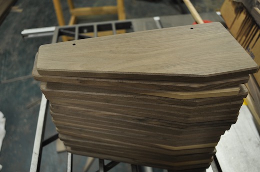 To cut the final shape of the panels, they are mounted in a jig with a master pattern and
